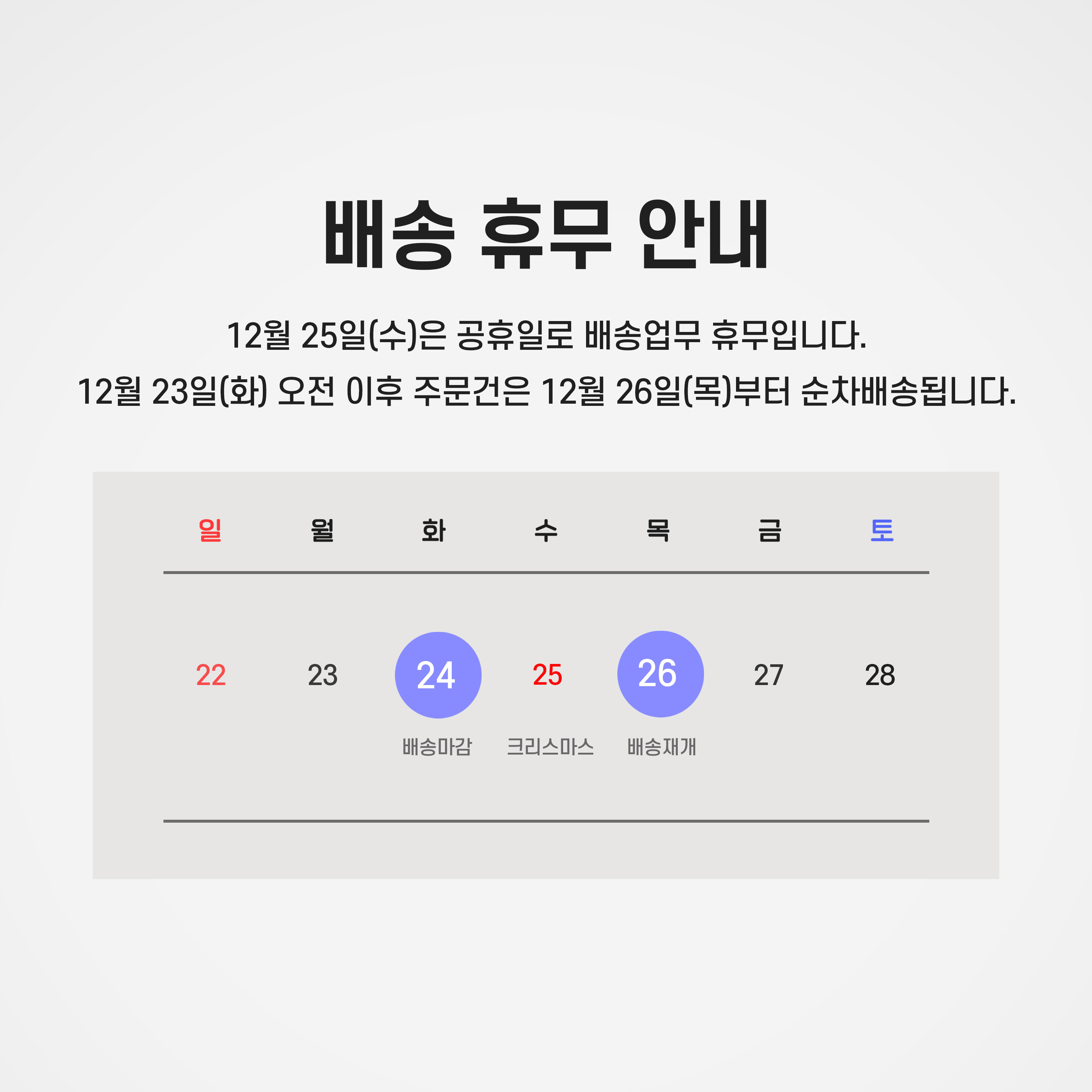 12월23일 오전11시 이후 주문건은 크리스마스 휴무로인하여 12월26일부터 순차출고됩니다