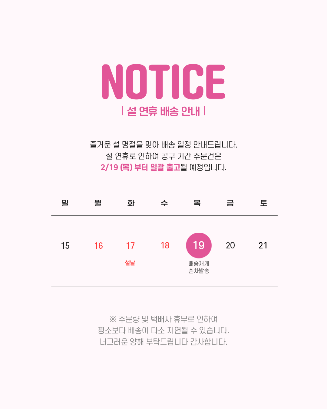 (설 연휴로 인한 결제완료건은 19(목) 일괄출고됩니다.)