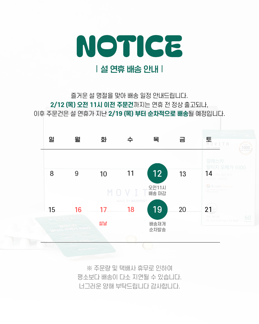 (설 연휴로 인하여 12일(목) 오전 11시 결제완료건까지 당일출고되며, 이후 결제완료건은 19(목)부터 순차출고될 예정입니다.)