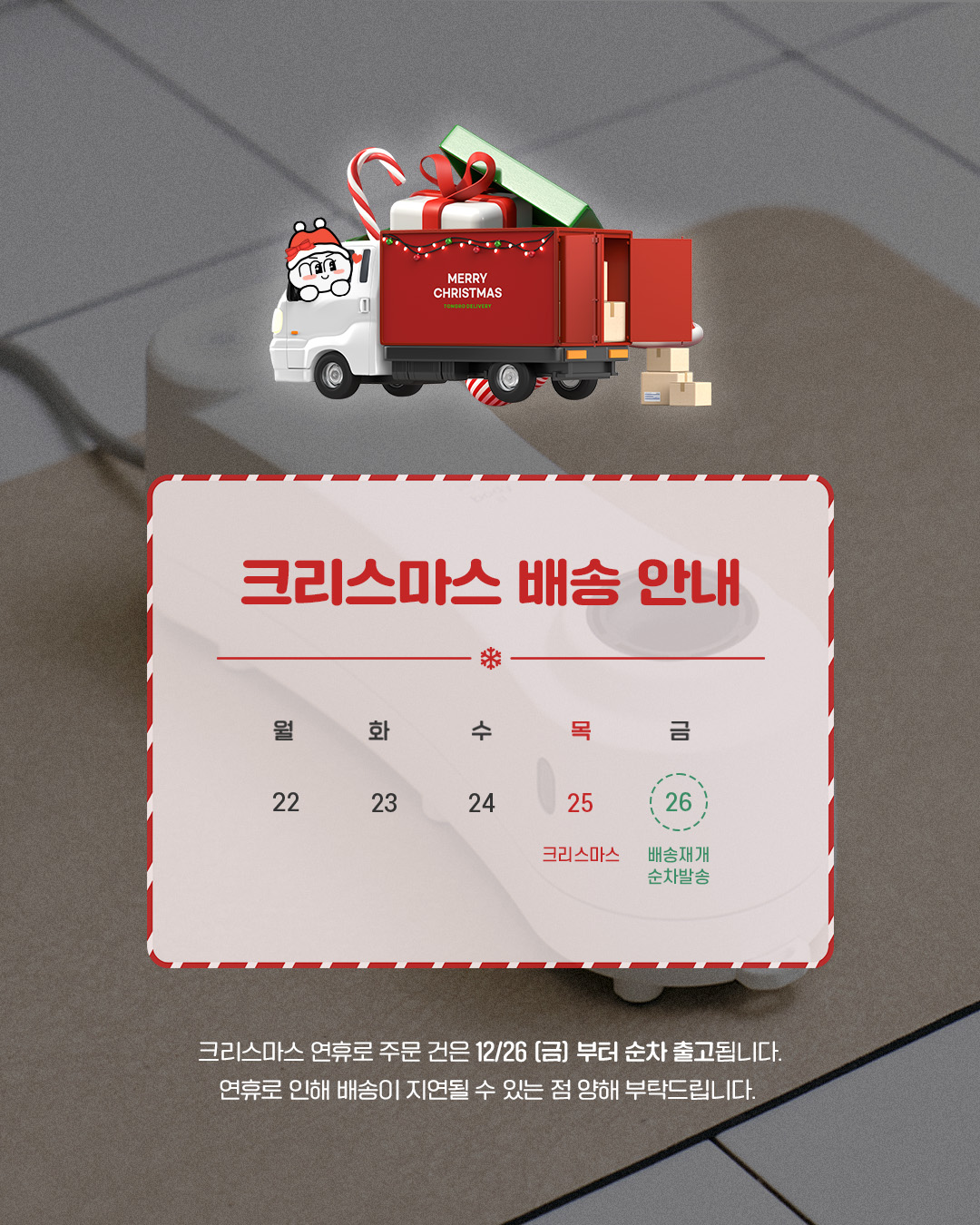 *25(목) 크리스마스 연휴로 인한 26(금) 일괄출고됩니다.