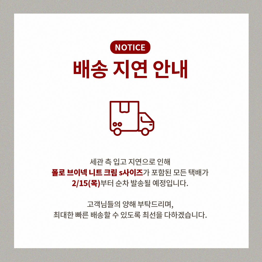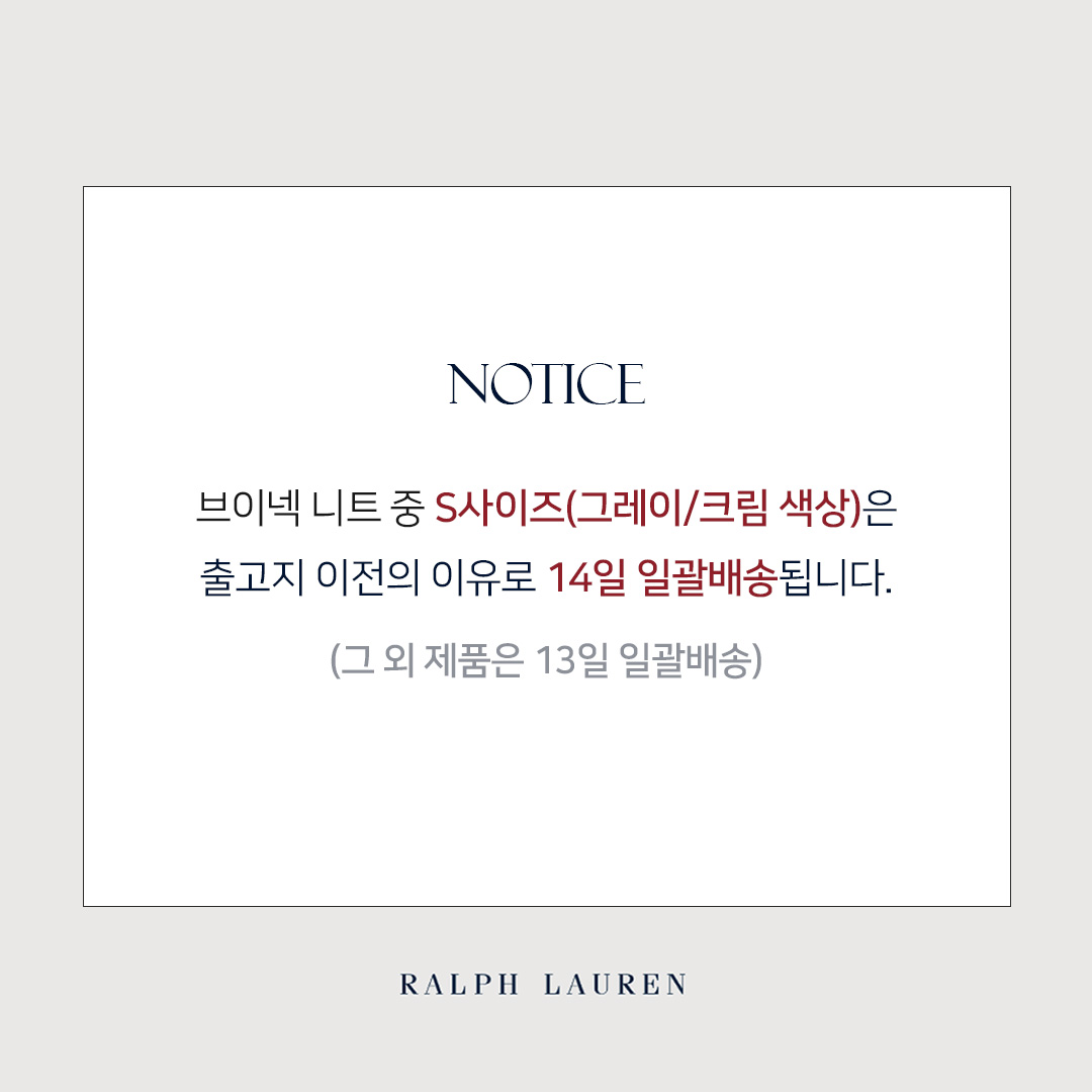 (그레이 S사이즈 기존대로 14일(수) 출고 / 크림 S사이즈같은 경우 세관 측 입고지연으로 인해 15일(목) 순차출고됩니다)